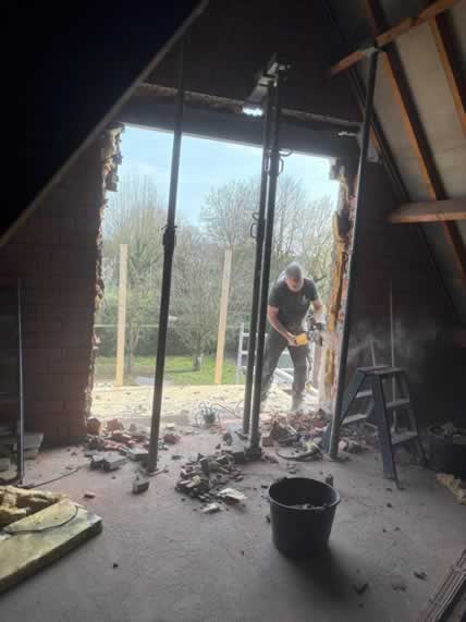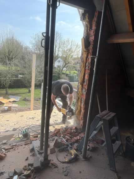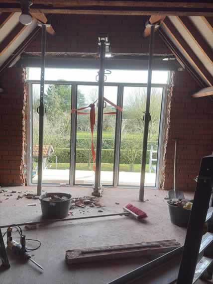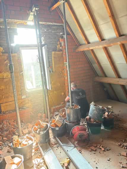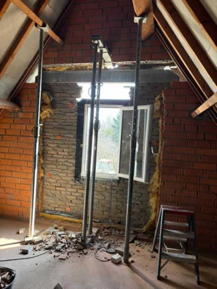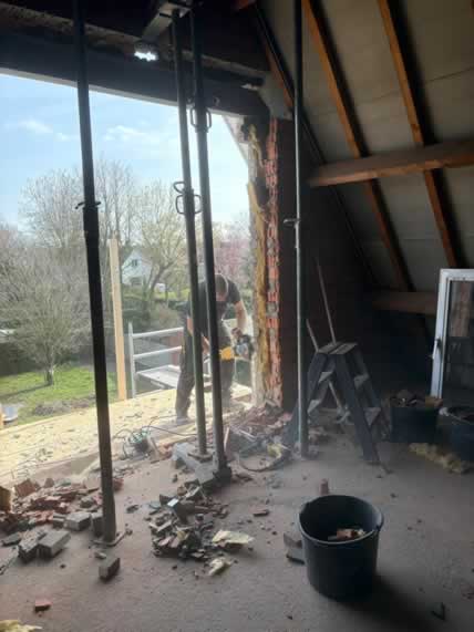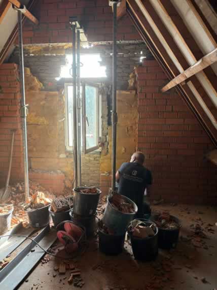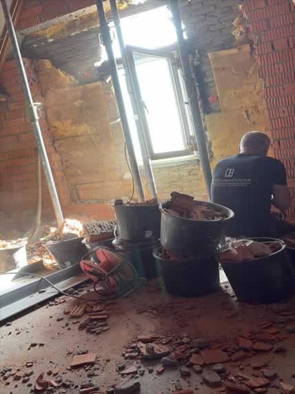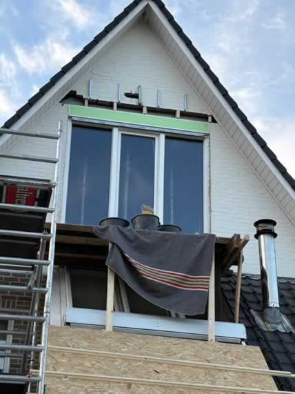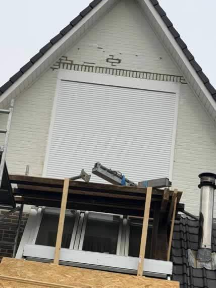 De bestaande opening werd zorgvuldig vergroot om ruimte te maken voor een nieuw maatwerk kozijn met rolluiken. Door de ligging hoog in de gevel en de aanwezige serre onder het werkgebied vroeg dit project om een veilige en doordachte aanpak.